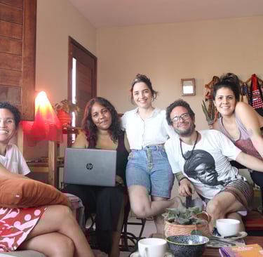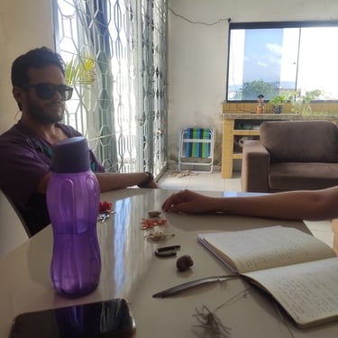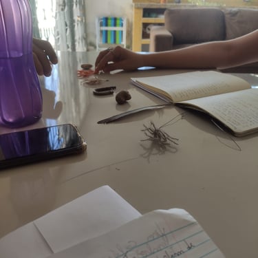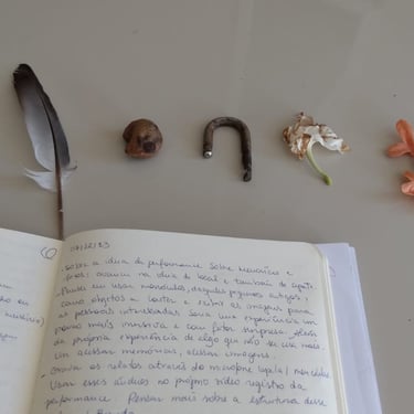 Nossos encontros de orientação foram divididos em duas etapas, contando com leituras, discussão de textos, compartilhamento de referências, atividades práticas e apresentação dos exercícios realizados. Foi o momento de entrar em contato com as nossas memórias, intenções de pesquisa e processo criativo.