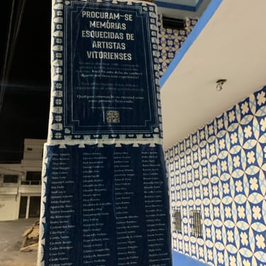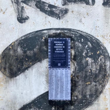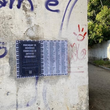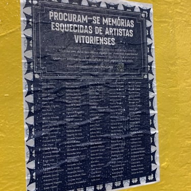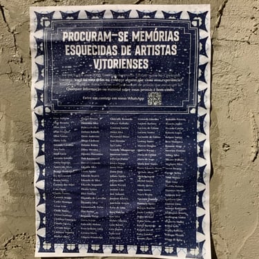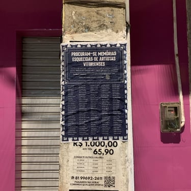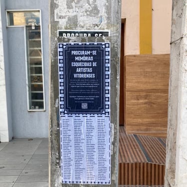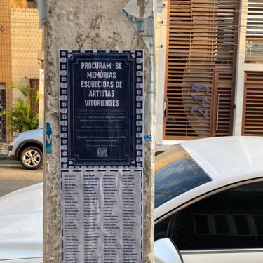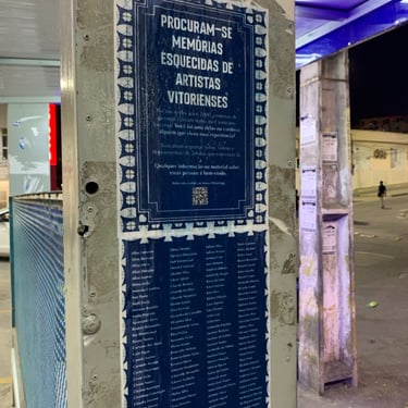 Procuram-se Memórias Esquecidas de Artistas Vitorienses é uma ação performativa de caráter poético-documental, realizada nas ruas de Vitória de Santo Antão (PE), que se propõe a ativar os esquecimentos e silêncios que permeiam a memória teatral da cidade. Partindo de um gesto simples e contundente — a colagem de cartazes do tipo lambe-lambe com nomes de artistas locais que, em algum momento, fizeram teatro — a obra traça um mapeamento afetivo das trajetórias que moldaram a cena vitoriense e que, muitas vezes, permaneceram à margem dos registros oficiais.