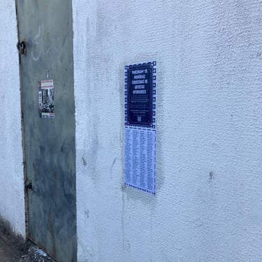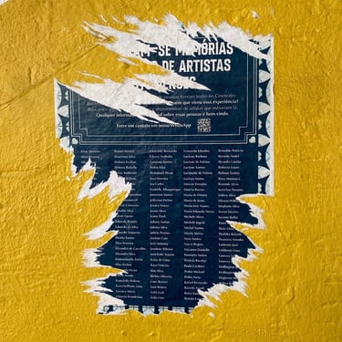 A performance acontece no espaço urbano, ocupando ruas, praças e muros como superfícies de escrita e de evocação. Ao espalhar esses nomes pela cidade, o artista-performer reativa presenças, convoca lembranças e provoca uma escuta coletiva, abrindo caminhos para o reconhecimento e a valorização da memória cultural local. Junto aos nomes, um número de telefone impresso nos cartazes convidava os passantes a partilhar histórias, memórias e lembranças desses artistas — ampliando a ação para o campo da conversa e da investigação compartilhada.
